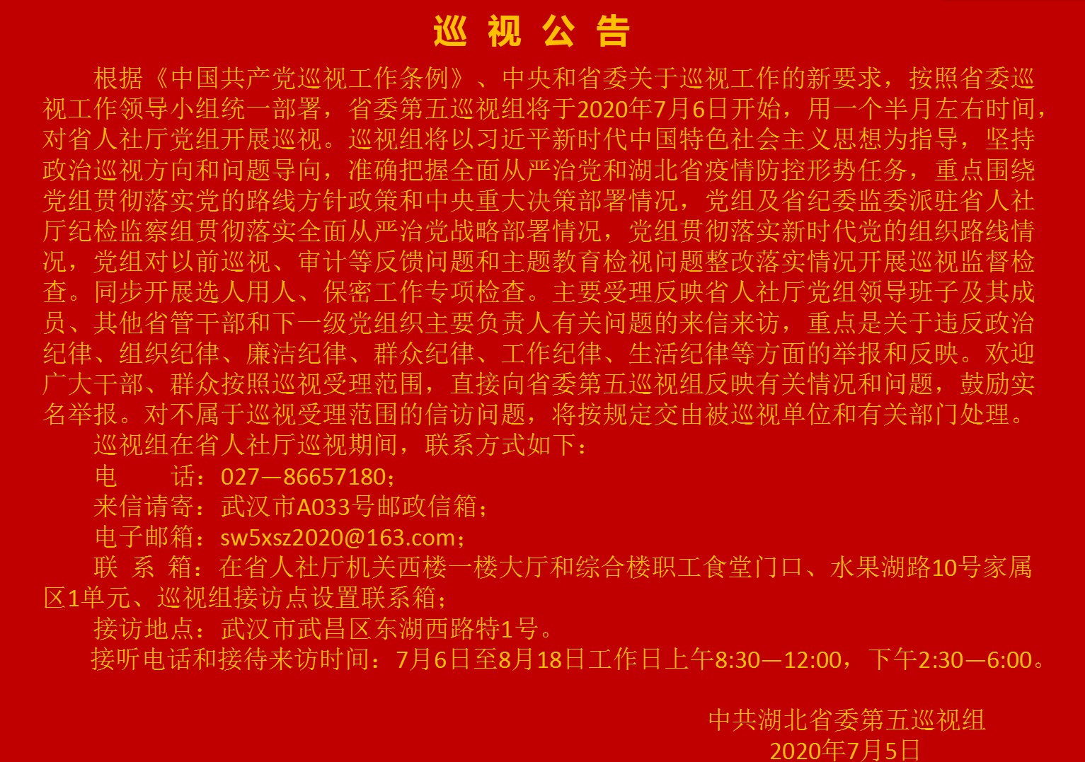 根据《中国共产党巡视工作条例》、中央和省委关于巡视工作的新要求,按照省委巡视工作领导小组统一部署,省委第五巡视组将于2020年7月6日开始,用一个半月左右时间,对WG彩票 党组开展巡视。巡视组将以习近平新时代中国特色社会主义思想为指导,坚持政治巡视方向和问题导向,准确把握全面从严治党和湖北省疫情防控形势任务,重点围绕党组贯彻落实党的路线方针政策和党中央重大决策部署情况,党组及省纪委监委派驻WG彩票 纪检监察组贯彻落实全面从严治党战略部署情况,党组贯彻落实新时代党的组织路线情况,党组对以前巡视、审计等反馈问题和主题教育检视问题整改落实情况开展巡视监督检查。同步开展选人用人、保密工作专项检查。主要受理反映WG彩票 党组领导班子及其成员、其他省管干部和下一级党组织主要负责人有关问题的来信来访,重点是关于违反政治纪律、组织纪律、廉洁纪律、群众纪律、工作纪律、生活纪律等方面的举报和反映。欢迎广大干部、群众按照巡视受理范围,直接向省委第五巡视组反映有关情况和问题,鼓励实名举报。对不属于巡视受理范围的信访问题,将按规定交由被巡视单位和有关部门处理。