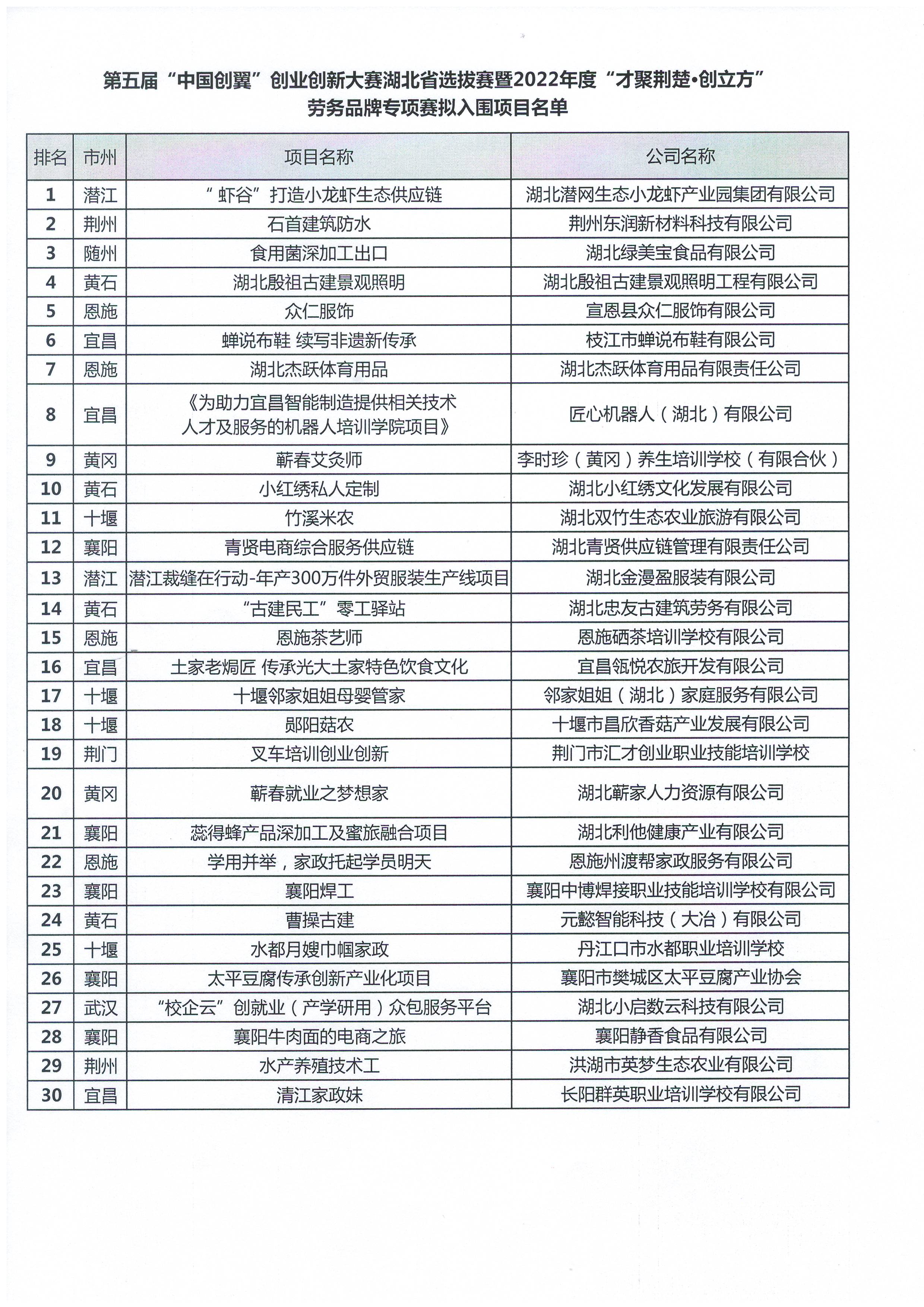 附件:第五届“中国创翼”创业创新大赛湖北省选拔赛暨2022年度“才聚荆楚·创立方”劳务品牌专项赛拟入围项目名单
