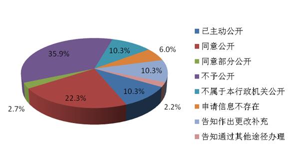 184件依申请公开件全部按规定答复。其中,“已主动公开”19件,占总数10.3%,“同意公开”41件,占总数22.3%;“同意部分公开”5件,占总数2.7%;“不予公开”66件,占总数35.9%;“不属于本行政机关公开”19件,占总数10.3%;“申请信息不存在”11件,占总数6.0%;“告知作出更改补充”19件,占总数10.3%;“告知通过其他途径办理”4件,占总数2.2%。