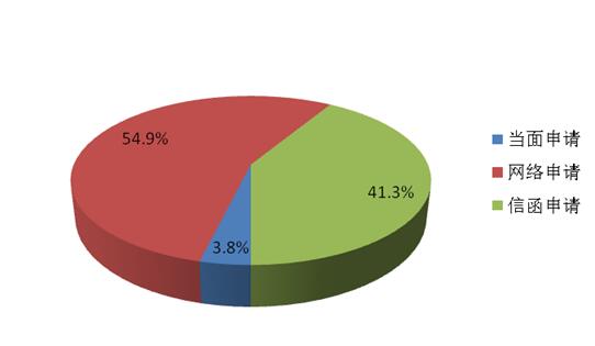 2016年度,通过当面、网络、信函等多种形式受理信息公开申请184件,其中,当面申请为7件,网络申请为101件,信函申请为76件,所占比重分别为3.8%、54.9%、41.3%。